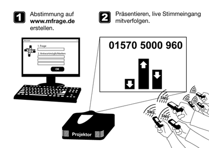 Ohne Ted-Geräte und Papier. Einfach online die Abstimmung einrichten und per Website auf Beamer-Leinwand zeigen. Das Publikum wählt per SMS und sieht sofort das Ergebnis.
